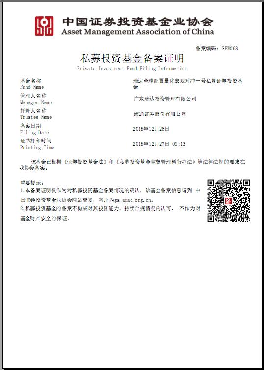 广东瑞达投资管理有限公司作为管理人,海通证券股份有限公司作为托管人的私募基金《瑞达全球配置量化宏观对冲一号私募证券投资基金》正式上线运作,欢迎各位朋友莅临交流。