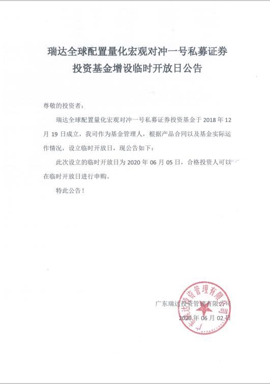 瑞达全球配置量化宏观对冲一号私募证券投资基金临时开放公告